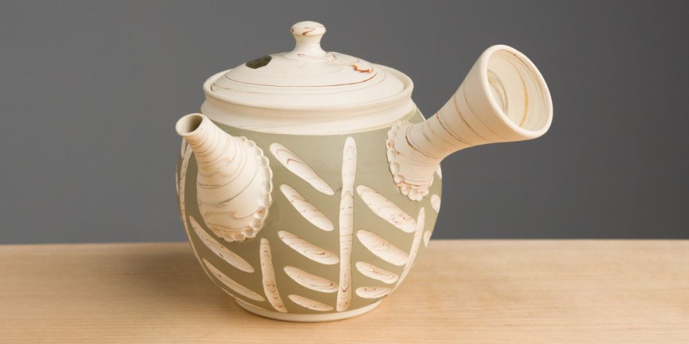 Hieman kookkaampi Tokonamen kyusu Kenji-studiolta. Kenjin studion perusti Kenji Hotta 1970-luvulla. Perustajan kuoltua studiota johtaa Kenji Hottan poika Takumi Hotta. Studio on erityisen kuuluisa merikomi-tekniikalla tehdyillä astioista. Näissä on marmorimainen ulkonäkö joka saadaan aikaan sekoittamalla erivärisiä savulaatuja ja muokkaamalla teekannu tästä sekoituksesta. Studio on viimevuosina tehnyt erityisen modernin ja rohkean näköisiä tokonamen kyusuja ja muita astioita. Tämä kyusu on hieman kookkaampi ja siinä on vaalea savisekoitus. Tämän lisäksi kannun kyljille on levitetty kerros ohutta vihrtävänharmaata savea, johon on tehty rohkeita suuria uurteita, joka paljastaa vaalean marmorimaisen runkorakenteen saven. Nämä kuviot antavat teekannulle viljan tai bambun mieleen tuovan ilmeen. Teekannun kahvan ja nokan kiinnitys runkoon on lisäksi tehty pistemäisillä painerruksilla, jotka tekevät liitoksesta erityisen korostetun liitoksen piilottamisen sijaan. Tämä korostus on epäintuitiivisen tyylikäs ja antaa teekannun ulkonäköön kiinnostavaa särmää. Teekannussa on mainio laakea pienireikäinen siivilä minkä ansiosta se toimii mainiosti silppuisenkin teen hauduttamiseen. Toimitamme kyusun koristellussa pahvilaatikossa.
