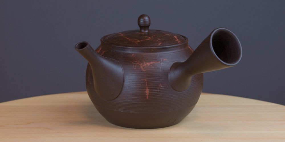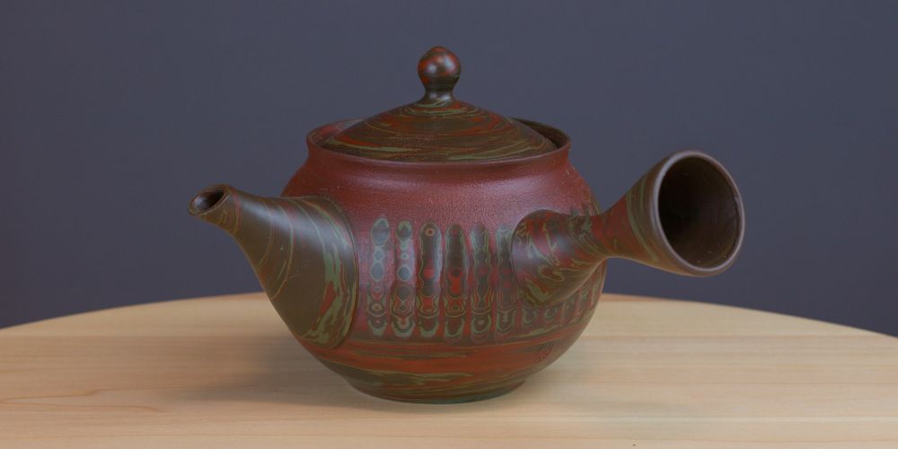 Tokonamen kaupungin keramiikkaa oleva keskikokoinen kyusu. Kyusu on koristeltu rakeisella viivakuviolla ja poltossa teekannun kyljet ovat värjäytyneet eri värisiksi antaen astialle kontrastikkaan värin.