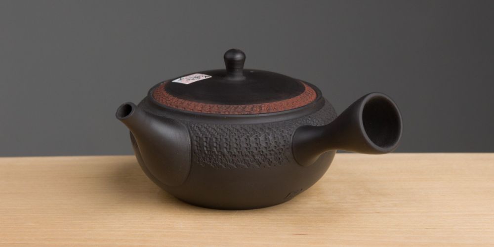 Keskikokoinen Tokonamen kyusu Gyokkon studiolta. Gyokkon studiota pyörittää Umeharan keramiikkaperhe. Kyusun suuaukon alla ja kannen reunoilla on orgaanisen näköinen kuviointi joka on luotu kuvioidulla rullalla. Kannen reunoilla kuviointi on värjätty punertavaksi, joka antaa teekannun ilmeeseen lämpöä. Teekannu on redusoivan polton ansiosta täysin musta. Siinä on mainio laakea pienireikäinen siivilä minkä ansiosta se toimii mainiosti silppuisenkin teen hauduttamiseen. Toimitamme kyusun koristellussa pahvilaatikossa.