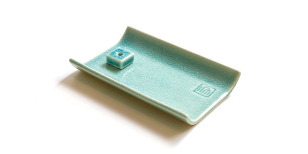Nippon Kodon celadon-suitsukepidike, joka koostuu alustasta sekä irtonaisesta pidikepalasta, jonka reikään suitsuketikku voidaan asettaa. Upea vihreä celadon-lasite.